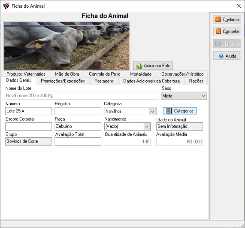 As fichas individuais ou dos lotes serão ajustadas automaticamente pelo sistema de acordo com a espécie de animal cadastrada pelo usuário. Assim, os controles serão 100% direcionados para as características da espécie, como por exemplo, controle da produção de leite para gado leiteiro e cabras; Controle da produção de ovos para aves poedeiras; Controle de peso para bovinos de corte, frangos de corte, caprinos, ovinos, suínos, etc; Controle de partos para vacas, cabras, éguas e outras; Controle de mortalidade e refugagem para aves e suínos; E assim sucessivamente.